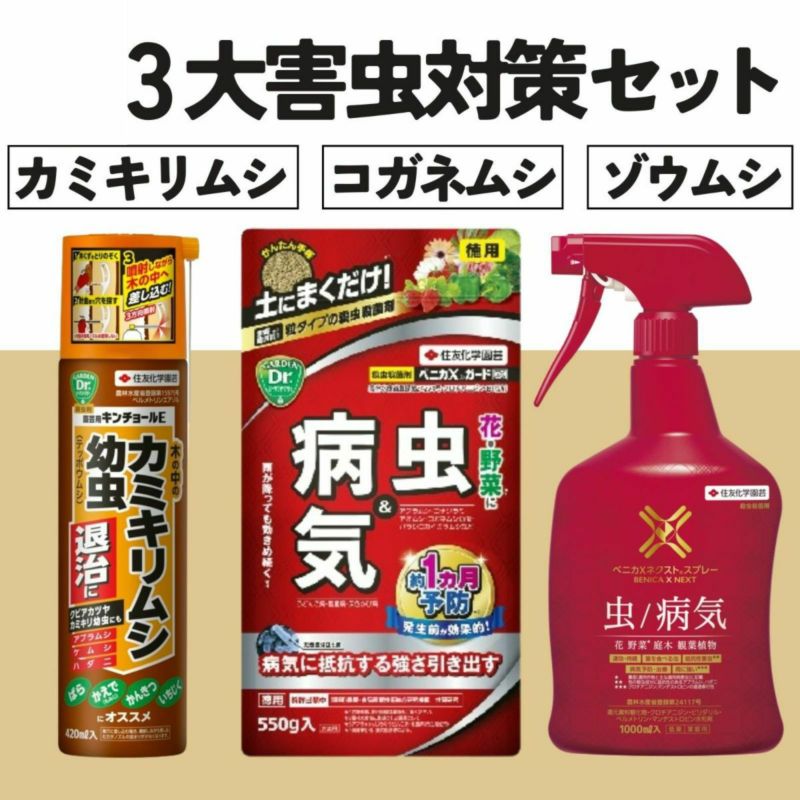 バラの3大害虫である、ゴマダラカミキリの幼虫・コガネムシの幼虫・ゾウムシの成虫に効く薬剤をセットにしました。