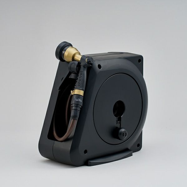 手を汚さずにホースをきれいに巻きとれ、日差しからホースを守るカバーが特徴です。ブランドロゴをあしらった木製プレートがついています。