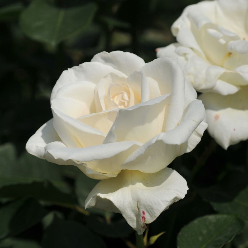 ワイングラスのように抱えた花型。ほんのりとアイボリー色がかかる白花。20 世紀に代表されるハイブリッド ティの名花で、品のよいフルーティな芳香があります。枝、葉はしっかりと育つため、巨大輪ながらバランスが良く、とても見栄えがあります。