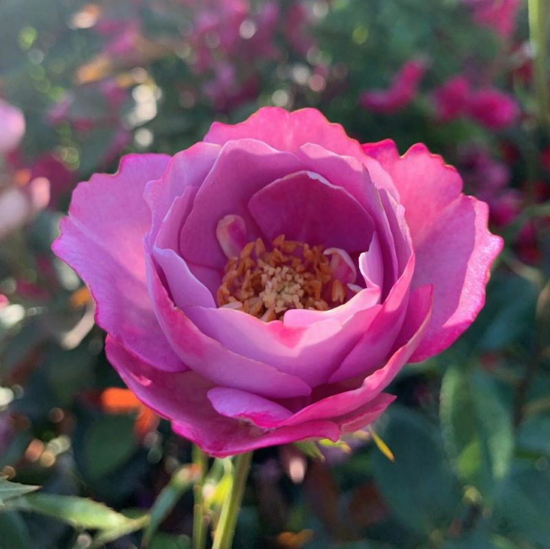 やや小さめの花のコロンコロンとした可愛いバラ。青みをおびた淡い紫色の、淑やかで物静かなその気配が素敵です。花はのちに奥ゆかしく黄金色の花芯をのぞかせる。とてもよい香り。ブルー系では紅一点の個性と美しさを持ち合わせるF&Gローズです。切花市場・花雑誌でも今注目されているバラです。