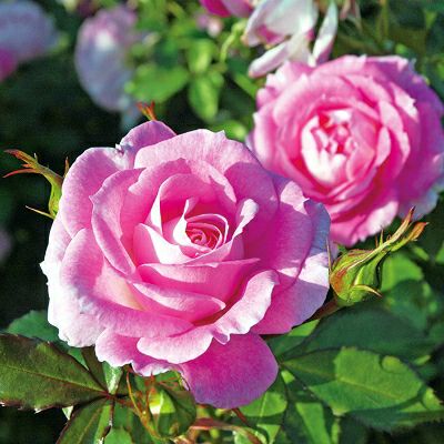 おいしそうなストロベリーピンクの花色 と、カップ咲きの花形が魅力的です。花は 5~8輪の房になり、開花とともに白っぽ く、最盛期はピンクと白がたわわに咲きほころびます。