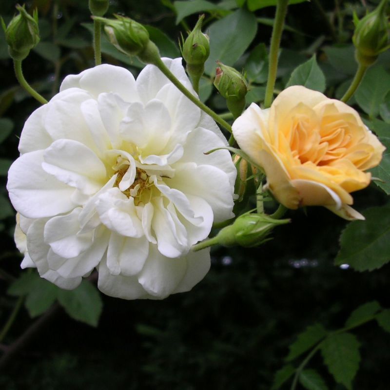 トゲのほとんどないつるバラ。優し気なクリームイエロー色の5㎝程の花は、大抵の場合房になって咲きます。柳のような枝垂れ風情に伸びる枝は、やや大柄に育ちますが、花の最盛期はそれを覆いつくすほどたわわに咲かせます。大きな鉢でも育てられますが、大きく育つためパーゴラ、家の壁面などの仕立てにとくに向きます。