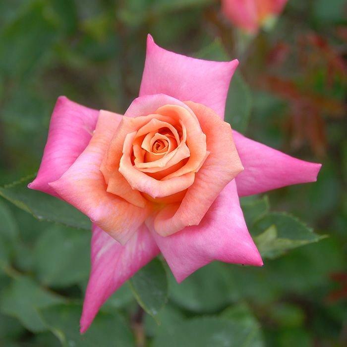 杏色に珊瑚色が浮かび、花びらの縁は桃色 となる3色咲き。花色は季節によって微妙 に変化します。樹は半直立に生育します。 花径12~13cm、剣弁高芯咲き。花名は、 季節ごとに色彩を変えて魅了する、京都の同名の景勝地から。