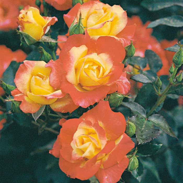 黄色に赤い覆輪がかかり、最後は赤でおわる華やかな色彩で、樹は半直立にまとまり、明るい緑の照葉との調和もよい。