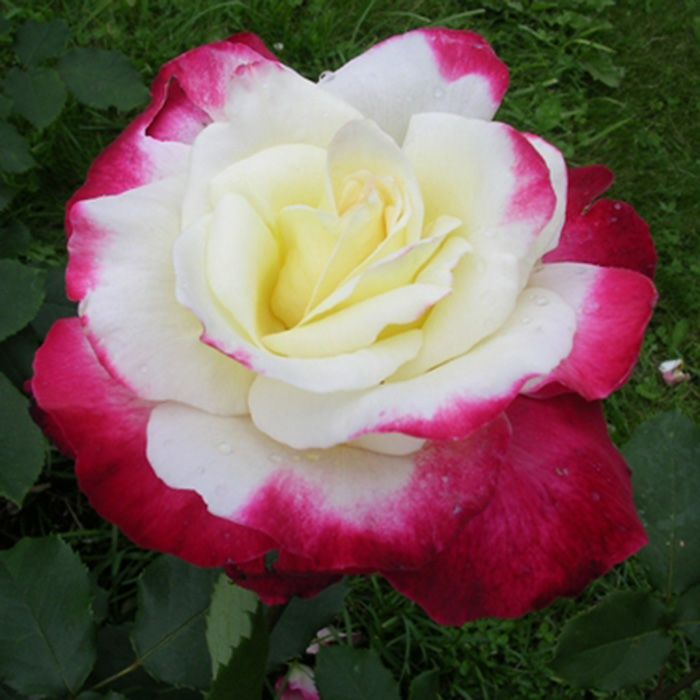 花色は陽射しを受けると、クリーム白色に赤色の縁取り(覆輪)がくっきり入り、日照が弱いとピンクの縁取りのやさしい色彩となります。やや早咲きの大輪種。