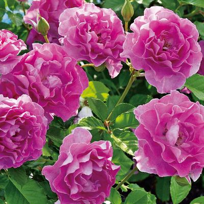 濃い紫色から咲き始めて、淡いモーヴ色に咲き進みながら波打って重なります。花径6 ~8センチの中大輪の房咲きで、枝先にたくさんの花を咲かせます。高さ1.0~0.7メー トルのコンパクトな株で、トゲの少ない育てやすいバラです。ブルー系の香りにハマナスの香りのまじるちょっと大人チックな芳香種です。