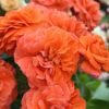 待望の濃いオレンジのつるバラです。つるバラにはあまりない鮮やかなオレンジ色の花は退色しにくく、房になって咲きます。うどんこ病、黒星病に強いです。寒さに当たると枝に黒いシミができますが、病気ではなく生育に問題はありません。2016年ADR受賞、他。濃いオレンジの丸弁ロゼット咲き、中輪です。 花径8?10cm、弁数60?70枚。房咲きになり、秋にも花をつける、耐病性品種です。微香。