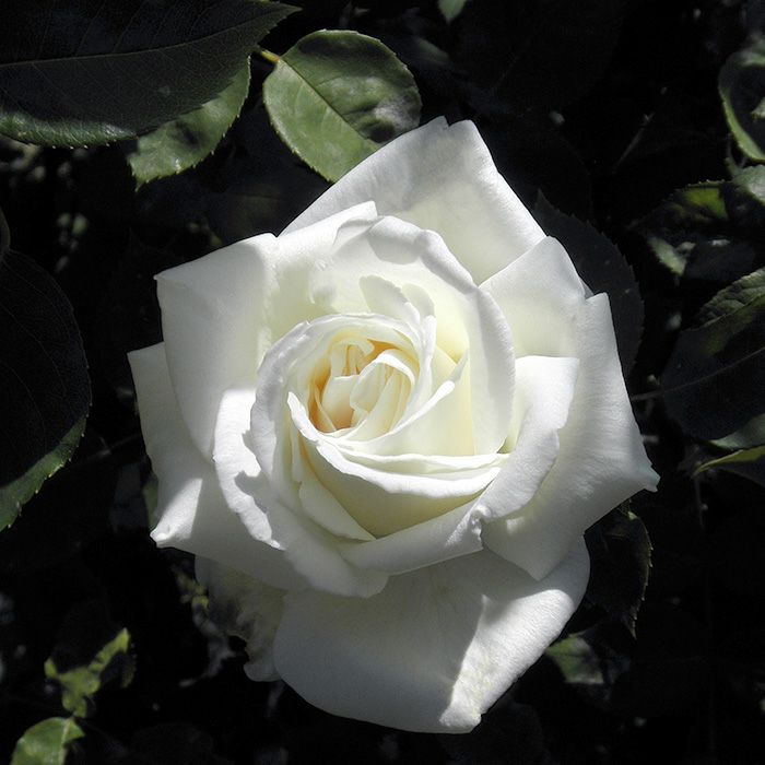 純白色の大輪咲き。花径13~15cm、ふくよかな姿をした半剣弁咲き。咲き進むと、 幾重にも織り重なるアプリコット色の花びらが顔をのぞく。樹は半直立に生育。深いティの香りがある。