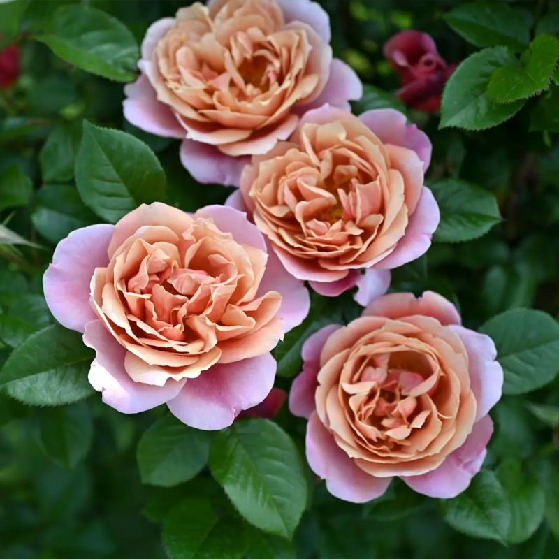 明るいブラウンからピンク色のグラデーションの中大輪花。勢いの良い元気な枝が直立で茂るブッシュ樹形。コンパクトで鉢植えでも育てやすく、耐病性も強い。
