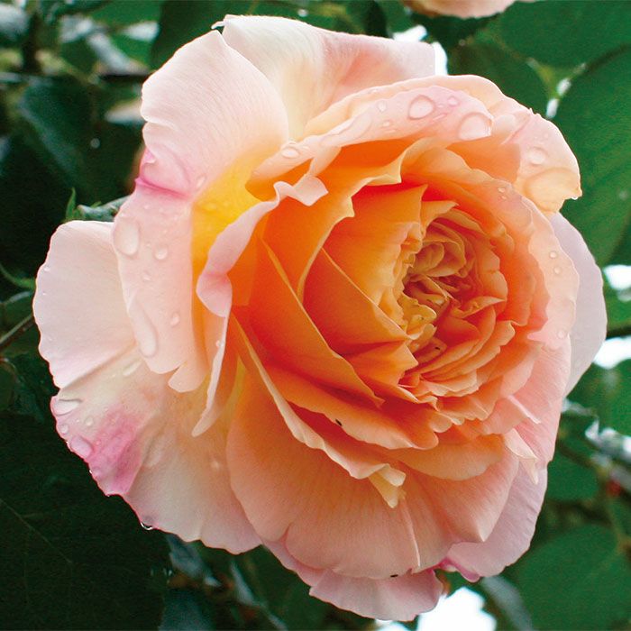 オレンジ、イエロー、アプリコットの微妙な色彩。ロゼット調の花は、花びらがフリフリとしてどこか愛らしさを覚えます。香りは、柑橘ベースのフルーツ香、とてもフレッシュです。弧の字を描くように伸び咲かせますが、アーチやウォールでの景観にも抜群です。