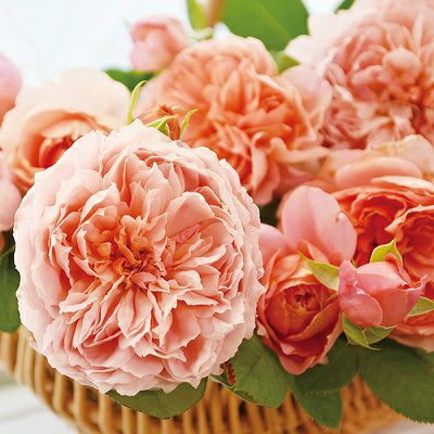 昼下がりの木漏れ日の中、人々が集い談笑する。ルノワールの絵画にもあるパリ・ モンマルトルのダンスホールの名が命名された花は、オレンジにサーモンピンクやベージュのグラデーションが美しい、カップ~ロゼット咲き大輪。中香。四季咲きで、秋花はカップが深く。株はシュラブ状で高さ1.5 ~ 2.5メートル。