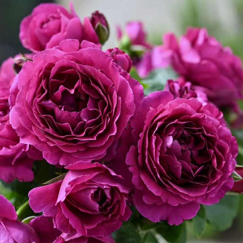 とても印象的な深みのある赤紫色の中大輪花。花弁がやさしく波打つロゼット咲き。数輪から5輪程度の房咲きになる。春一番の花は深い赤紫、二番花から夏の花は赤みが強くなり、秋の花は黒みの強い赤に。ローズとフルーツの香り。強香種のわりに花持ちがよく、雨などによる傷みも少ない。四季咲き性の中型シュラブ。枝は細めだがしっかりしていて樹形はきれいに整う。強めの剪定で鉢植えで自立シュラブとして仕立てることもできる。庭植えや大きめの鉢植えでは背丈ほどのシュートが伸びることもあるので、小さめのつる仕立ても可能。耐病性が強く育てやすい。名はフランスのシャンソンの名曲「さくらんぼの実る頃」から。