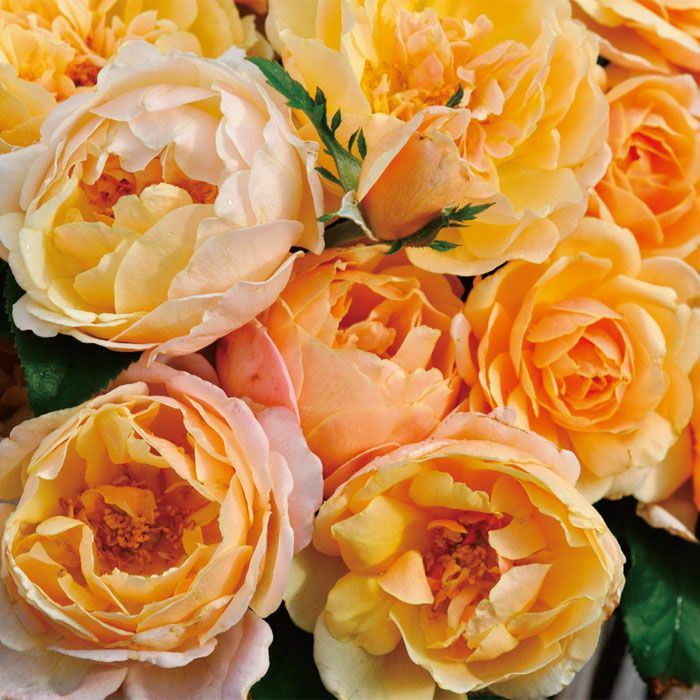 鮮やかな黄色の花、時折みせるオレンジ色の縁取り。秋にはオレンジ色を深めてアプリコットがかり、ボリューム感たっぷりのカップ咲きになります。深い緑色をした、しなやかな枝の四季咲きで、誘引してオベリスク、アーチ、フェンスなど幅広く仕立てられます。黄色系の花では数少ない耐病性に優れたバラ。初心者でも、簡単に育てられます。