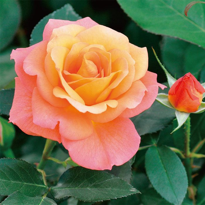 悲劇の運命を辿ったアンネ・フランクを偲み、アンネの父、オットー・フランク氏に寄贈し名付けられたバラ。咲き始めはオレンジ・アプリコット、のちにスカーレットとピンクに変わり、とても美しいです。花もちはひじょうによく、雨による花傷みも少なく優秀。
