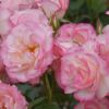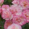 白地の花びらにパステルピンクの覆輪が 鮮やかに彩る、とても愛らしいバラ。花も ちに優れる四季咲き中輪系で、一枝に 数輪ずつ花を咲かせます。株はやや横 張りでコンパクトに生育します。名花 ストロベリーアイスを親に持つ。