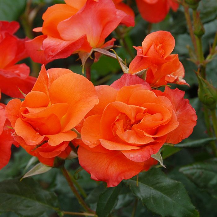 美智子皇后陛下が、皇太子妃時代に贈られた有名なバラです。花は鮮やかなオレンジ色、くっと指で摘まんだような花弁の半八重咲きで、一枝あたり1 輪から10 輪の房になって咲きます。昭和の時代、どのバラ園でも見られた懐かしいバラです。