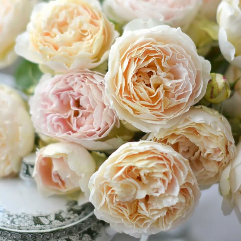淡いアプリコットイエローからクリーム色の花びらに乾いた筆で描いた様にピンクがのる。甘いフルーツにさわやかなハーブの強香。房で良く咲き、耐病性強くまとまりのある樹形。 優しく可愛らしい雰囲気の中に強さを持ったしなやかな女性をイメージして命名。