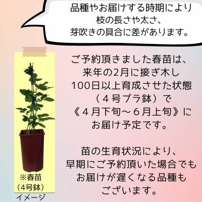 1~2月頃に接木し100日以上育成された苗。秋苗よりも低価格で品種数が多いのが特徴です。まだ若い苗なので、特にバラ育成経験者の方におすすめです。お届けは4月末〜6月頃を予定しております。
