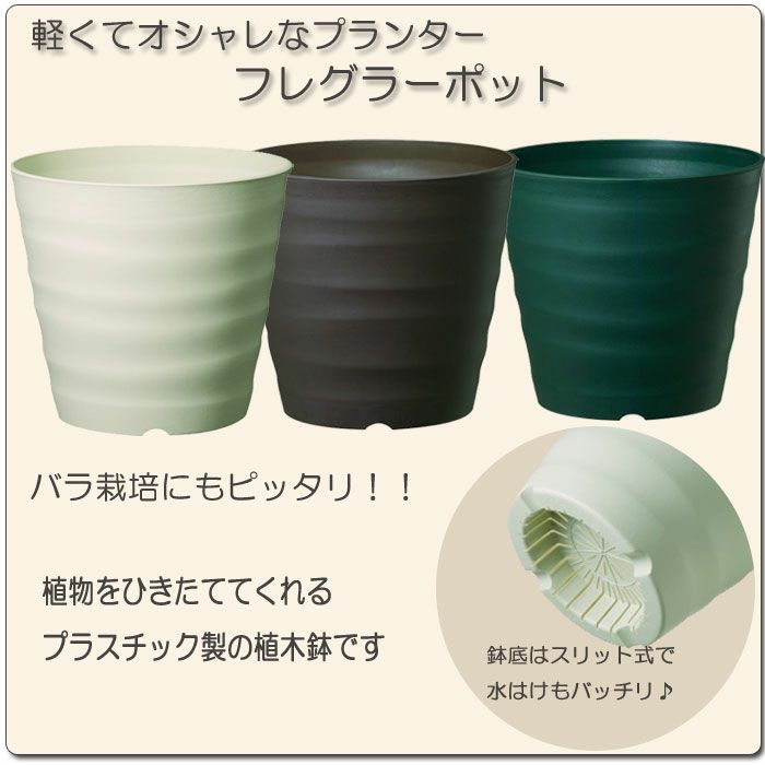 他の画像を見る 軽くてオシャレなプラスチック鉢♪ 【プラスチック鉢】フレグラーポット30型/10号サイズ/大和プラスティック/ガーデニング/園芸資材/植木鉢/ 販売価格 ¥ 1,045 税込 詳細を見る お気に入りに登録する